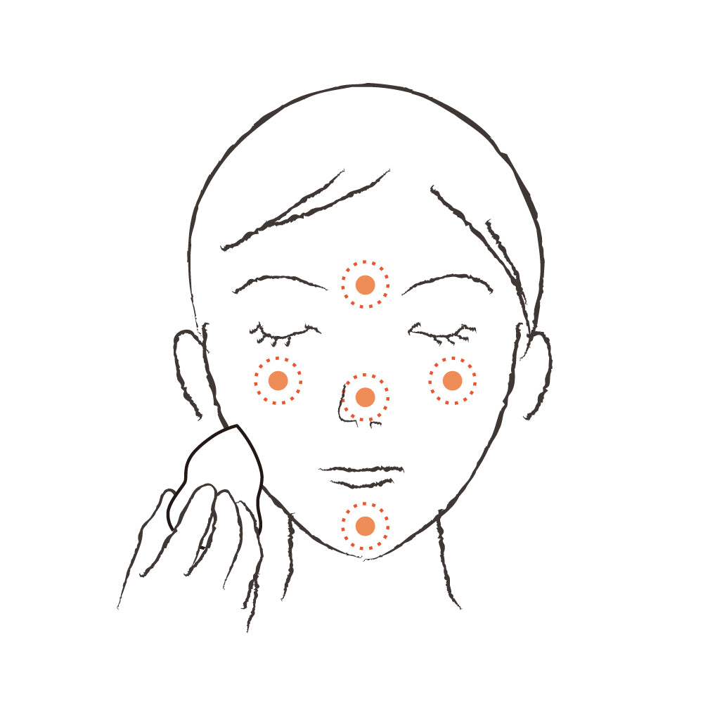 スポンジに取ったモイストデイカラーをひたい・両頬・鼻・あごにおきます。