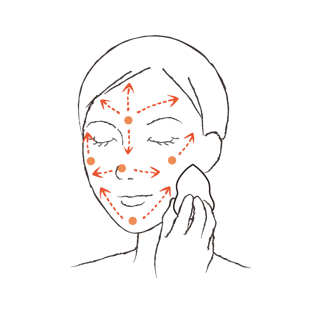 お顔の中心から外側に向かって、軽くスライドするようにすべらせ、伸ばします。